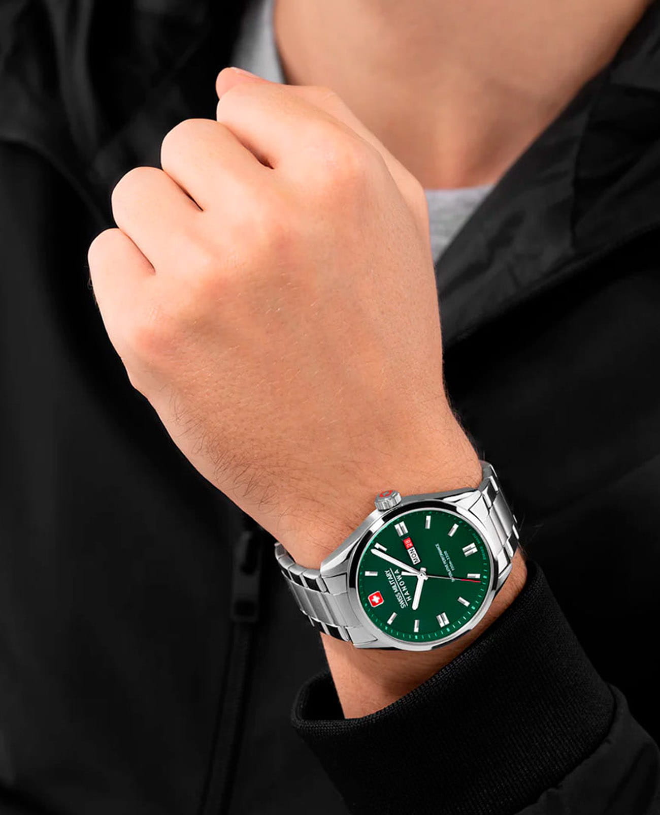 Мужские швейцарские часы с сапфировым стекломСапфировое стеклоПрочный и надёжный материал из кристалла сапфира синтетического происхождения, характеризующийся особой твёрдостью и устойчивостью к царапинам и повреждениям. Swiss Military Hanowa Maxed SMWGH0001603, кварцевый механизм с высокой точностью. Сапфировое стеклоСапфировое стеклоПрочный и надёжный материал из кристалла сапфира синтетического происхождения, характеризующийся особой твёрдостью и устойчивостью к царапинам и повреждениям. устойчивое к появлению царапин, обладающее высокой прозрачностью. Корпус часов изготовлен из стали. Окошко даты находится в положении 3 часов. Стрелки и метки с люминесцентным покрытиемЛюминесцентное покрытиеПозволяет считывать показания времени в темноте. Производители наносят на стрелки, часовые индексы, безель или поверхность циферблата светонакопительный состав, дающий холодное свечение.. Класс водозащиты: 100 метров, позволит плавать, нырять и заниматься другими водными видами спорта. Стальной браслет на раскладной застёжкеРаскладная застёжкаТакой тип застёжки используется только на браслетах из металла. Она никогда не раскрывается полностью, происходит разделение на 2 и более частей. Раскладывающая застёжка снизит вероятность потери часов к минимуму..