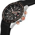 Внутри установлен швейцарский кварцевый механизм, обеспечивающий высокую точность хода. Функции включают хронографХронографФункция позволяет измерять отрезки времени с особой точностью: часы, минуты, секунды. Верным признаком хронографа является наличие на циферблате 3 дополнительных окошек-счётчиков. и тахиметрическую шкалу, позволяющие измерять скорость и промежутки времени.