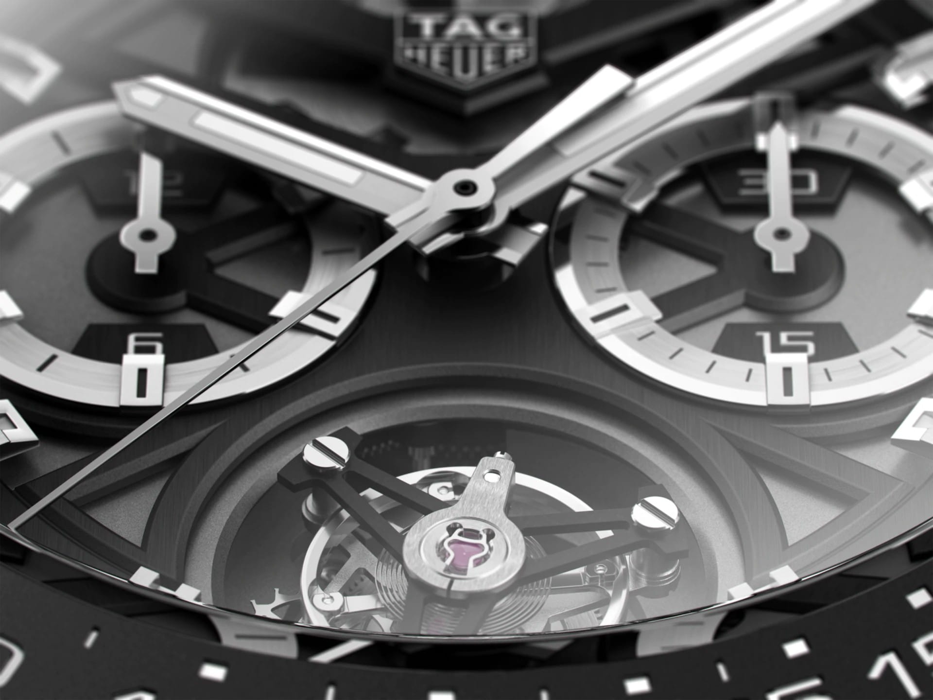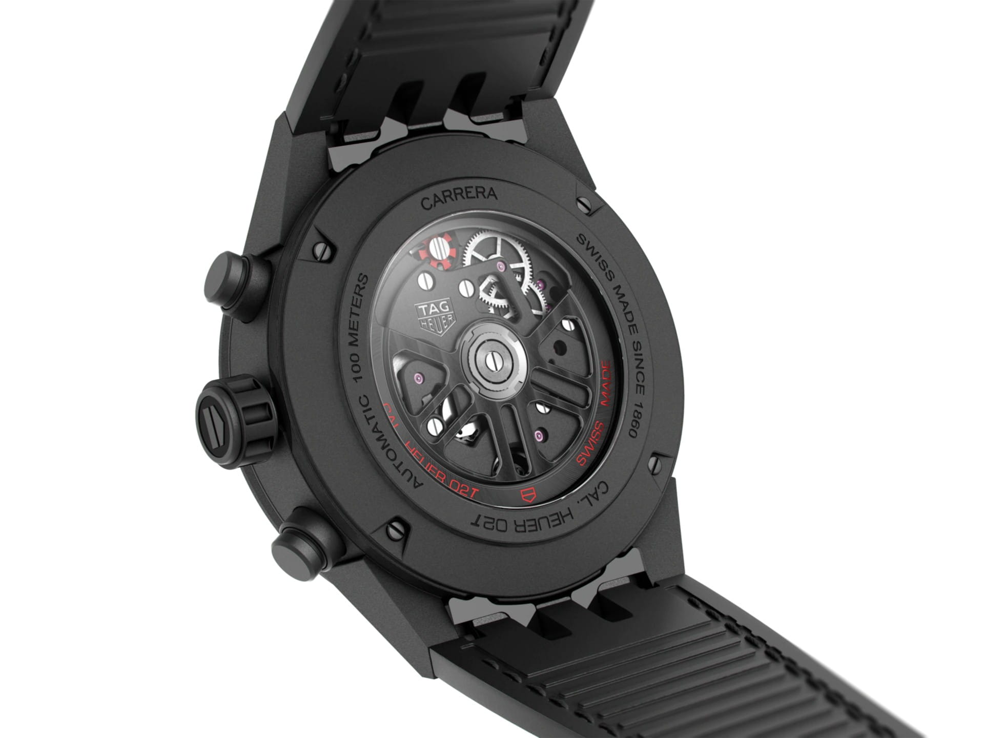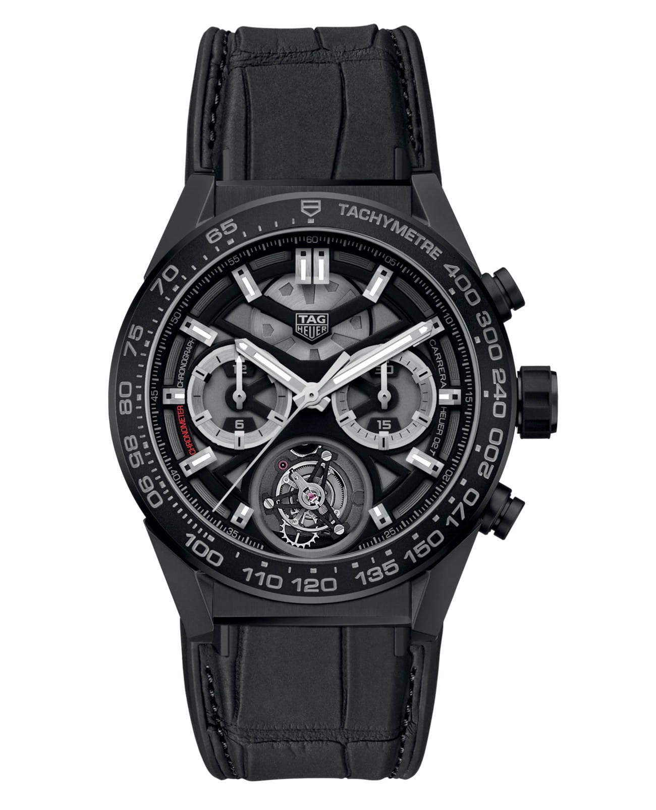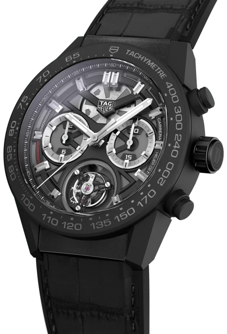 Хронограф TAG Heuer с турбийоном, отмеченный сертификатом COSC, в версии с 45-мм матовым корпусом из черной керамики. Настоящее произведение искусства со скелетонизированным циферблатом, серебристыми индикаторами и черным матовым ремешком из кожи и каучука, предназначенное для ношения на руке. TAG Heuer Carrera CAR5A90.FC6415, механический механизм (автоматический калибр) с высокой точностью. Сапфировое стекло устойчивое к появлению царапин, обладающее высокой прозрачностью. Класс водозащиты: 100 метров, позволит плавать, нырять и заниматься другими водными видами спорта. Корпус часов изготовлен из керамики, цвета.