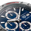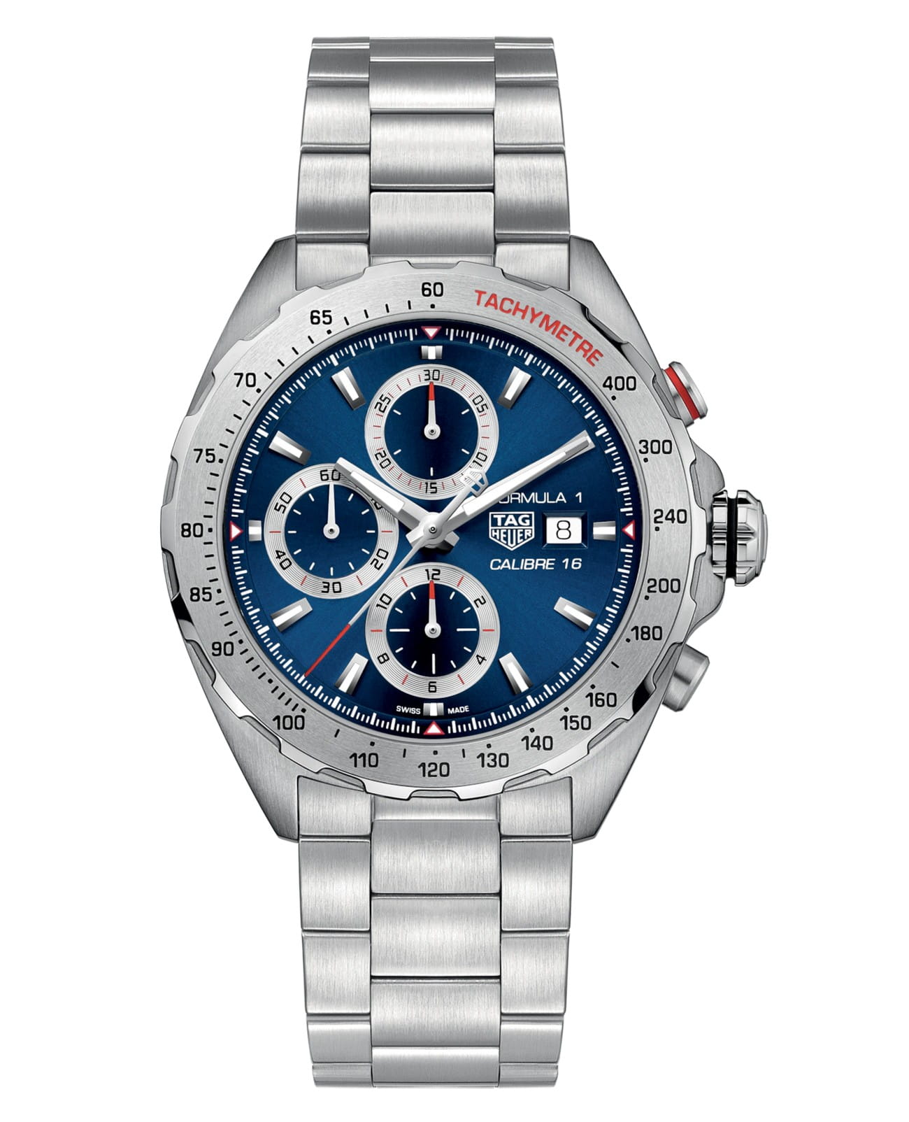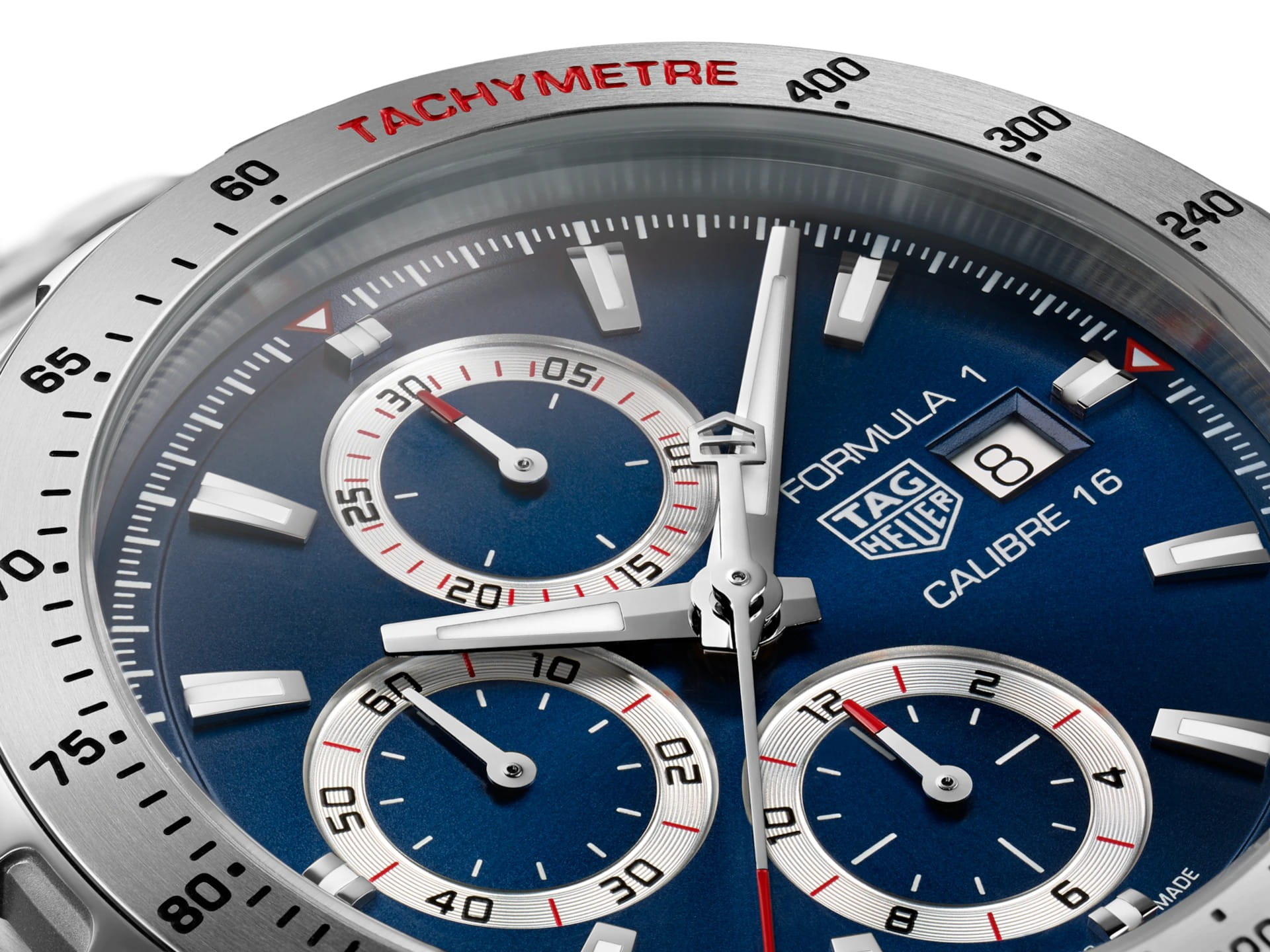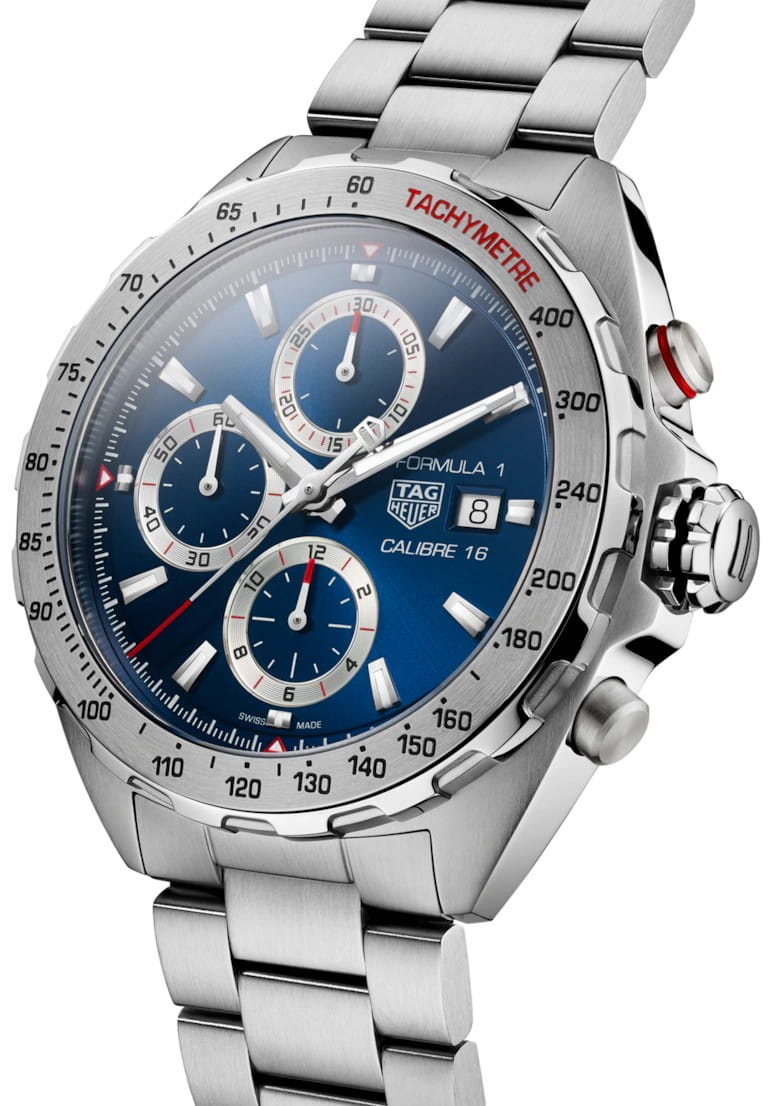 44-миллиметровый спортивный хронограф с переливающимся синим циферблатом, синими и серебряными вспомогательными циферблатами, матовым и полированным корпусом из нержавеющей стали. Неподвижный стальной безель с тахиметрической шкалой для преобразования расстояния в скорость. Мужские часы с хронографом TAG Heuer Formula 1 CAZ2015.BA0876, механический механизм (автоматический калибр) с высокой точностью. Сапфировое стекло устойчивое к появлению царапин, обладающее высокой прозрачностью. Класс водозащиты: 200 метров, позволит плавать, нырять и заниматься другими водными видами спорта. Корпус часов изготовлен из стали, серебристого цвета.