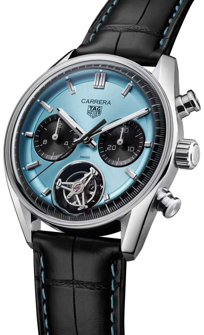 Часы TAG Heuer Carrera Chronograph Tourbillon CBS5014.FC6573. Эта потрясающая версия поднимает классическую модель Carrera на новые высоты. Часы оснащены мануфактурным механизмом TAG Heuer TH20-09. Фирменный дизайн циферблата придает часам эффектность, в то время как сапфировое стеклоСапфировое стеклоПрочный и надёжный материал из кристалла сапфира синтетического происхождения, характеризующийся особой твёрдостью и устойчивостью к царапинам и повреждениям. с выпуклой поверхностью обеспечивает сверхточную разборчивость.Часы-хронографХронографФункция позволяет измерять отрезки времени с особой точностью: часы, минуты, секунды. Верным признаком хронографа является наличие на циферблате 3 дополнительных окошек-счётчиков.. Механический механизм (автоматический калибр) с высокой точностью. Класс водозащиты: 100 метров, позволит плавать, нырять и заниматься другими водными видами спорта. Часы с люминесцентным покрытиемЛюминесцентное покрытиеПозволяет считывать показания времени в темноте. Производители наносят на стрелки, часовые индексы, безель или поверхность циферблата светонакопительный состав, дающий холодное свечение. Super-LumiNova. Корпус часов изготовлен из нержавеющей стали. Кожаный ремешок с раскладной застёжкойРаскладная застёжкаТакой тип застёжки используется только на браслетах из металла. Она никогда не раскрывается полностью, происходит разделение на 2 и более частей. Раскладывающая застёжка снизит вероятность потери часов к минимуму.. В комплекте с черным ремешком из кожи аллигатора, украшенным синей строчкой, эта модель выпускается ограниченным тиражом.