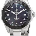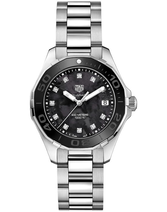 TAG Heuer Aquaracer WAY131M.BA0748 — элегантные женские часы, сочетающие стиль и функциональность. Корпус диаметром 35 мм и толщиной 10,75 мм выполнен из полированной нержавеющей стали, обеспечивая долговечность и устойчивость к коррозии. Лакированный циферблат оснащён накладными часовыми метками и стрелками с люминесцентным покрытиемЛюминесцентное покрытиеПозволяет считывать показания времени в темноте. Производители наносят на стрелки, часовые индексы, безель или поверхность циферблата светонакопительный состав, дающий холодное свечение., обеспечивающим отличную читаемость в любых условиях освещения. Его поверхность защищена сапфировым стекломСапфировое стеклоПрочный и надёжный материал из кристалла сапфира синтетического происхождения, характеризующийся особой твёрдостью и устойчивостью к царапинам и повреждениям., устойчивым к царапинам. Циферблат украшен 11 бриллиантами. Часы оснащены точным кварцевым механизмом, обеспечивающим стабильное отображение времени. Функциональность включает индикацию часов, минут, секунд и даты, расположенной на отметке «3 часа». БезельБезельВнешний ободок, закрепляющий стекло. В спортивных часах так называется поворотное кольцо с делениями на циферблате, выполняет роль таймера – замеряет отрезки времени на шкале. Неподвижный безель – элемент декора. Однонаправленно вращающийся безель на дайверских часах позволяет фиксировать моменты погружения и выныривания на поверхность. однонаправленный вращающийся, выполнен из стали, устойчивой к царапинам. Водозащита до 300 метров (30 бар) делает модель подходящей для дайвинга и активного образа жизни. Стальной браслет на раскладной застёжкеРаскладная застёжкаТакой тип застёжки используется только на браслетах из металла. Она никогда не раскрывается полностью, происходит разделение на 2 и более частей. Раскладывающая застёжка снизит вероятность потери часов к минимуму..