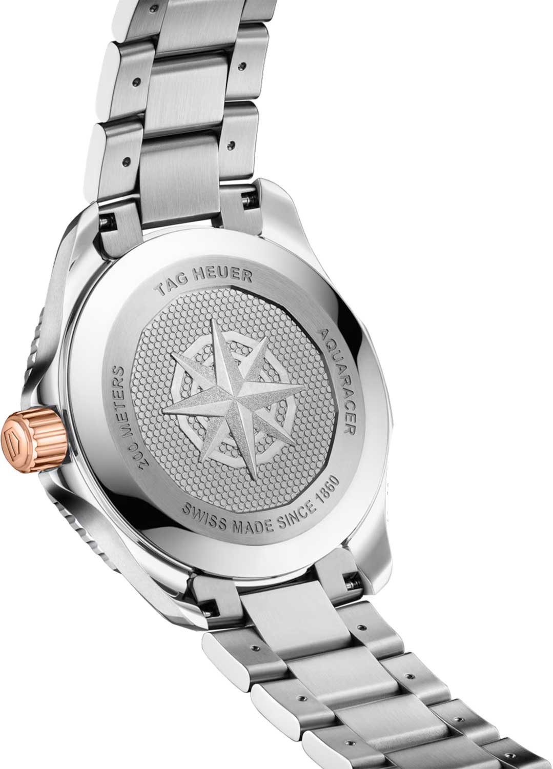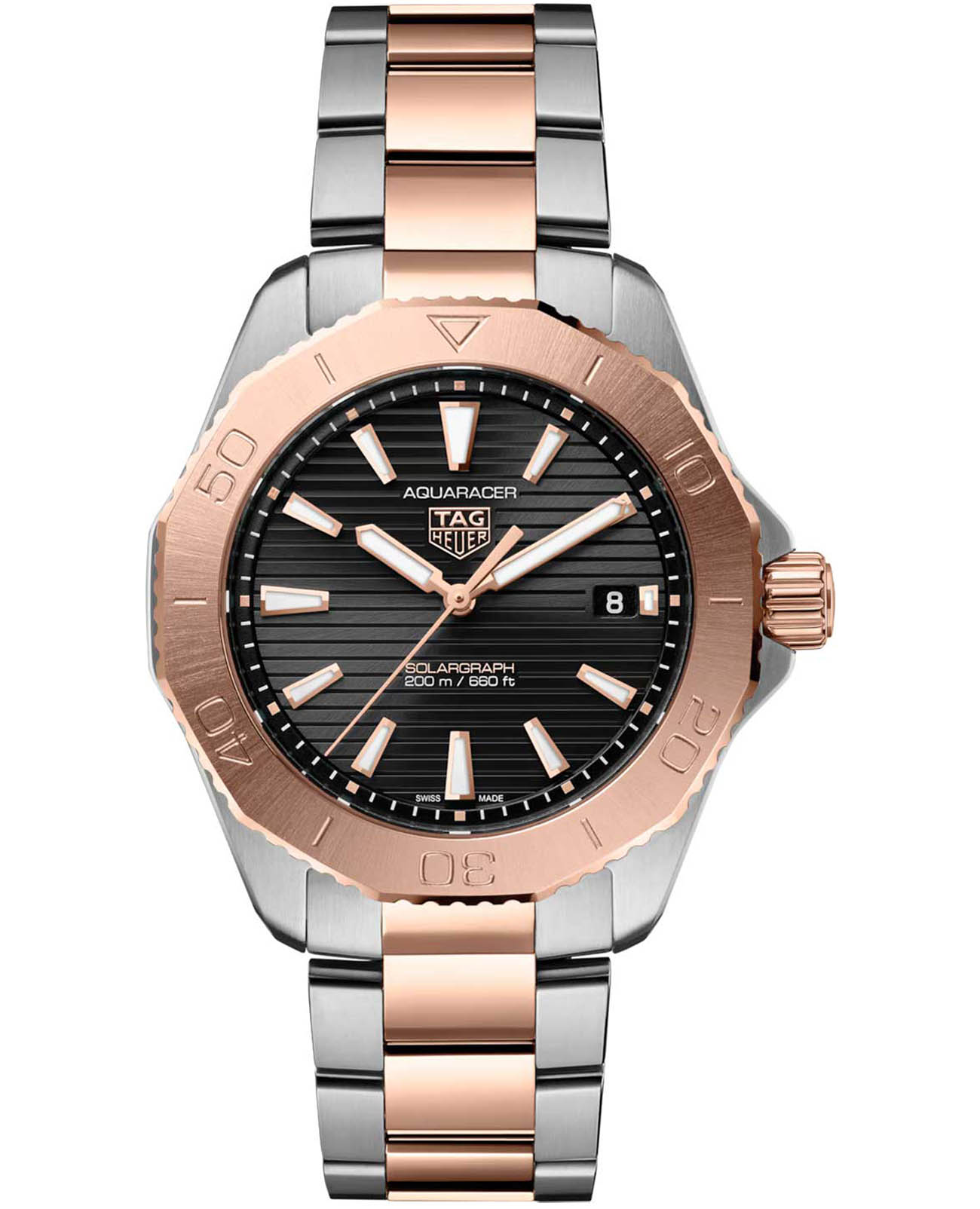 Часы TAG Heuer Aquaracer Professional 200 Solargraph WBP1121.BB0003. Высокая функциональность в нем сочетается с изысканной элегантностью, в то время как сапфировое стеклоСапфировое стеклоПрочный и надёжный материал из кристалла сапфира синтетического происхождения, характеризующийся особой твёрдостью и устойчивостью к царапинам и повреждениям. обеспечивает сверхточную разборчивость.Часы-хронографХронографФункция позволяет измерять отрезки времени с особой точностью: часы, минуты, секунды. Верным признаком хронографа является наличие на циферблате 3 дополнительных окошек-счётчиков.. Кварцевый механизм с высокой точностью. Класс водозащиты: 200 метров, позволит плавать, нырять и заниматься другими водными видами спорта. Часы с люминесцентным покрытиемЛюминесцентное покрытиеПозволяет считывать показания времени в темноте. Производители наносят на стрелки, часовые индексы, безель или поверхность циферблата светонакопительный состав, дающий холодное свечение. Superluminova. Корпус часов изготовлен из стали,  безельБезельВнешний ободок, закрепляющий стекло. В спортивных часах так называется поворотное кольцо с делениями на циферблате, выполняет роль таймера – замеряет отрезки времени на шкале. Неподвижный безель – элемент декора. Однонаправленно вращающийся безель на дайверских часах позволяет фиксировать моменты погружения и выныривания на поверхность. из стали с 18-каратным золотом18-каратное золотоОбозначение по каратной системе пробирования, оно показывает, сколько драгоценного металла содержится в изделии. 18 карат - в составе 75% чистого золота, соответствует 750 пробе.