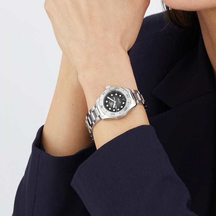 Женские механические швейцарские часы TAG Heuer Aquaracer Professional 200 WBP2410.BA0622, механический механизм (автоматический калибр) с высокой точностью. Сапфировое стеклоСапфировое стеклоПрочный и надёжный материал из кристалла сапфира синтетического происхождения, характеризующийся особой твёрдостью и устойчивостью к царапинам и повреждениям. устойчивое к появлению царапин, обладающее высокой прозрачностью. Класс водозащиты: 200 метров, позволит плавать, нырять и заниматься другими водными видами спорта. Корпус часов изготовлен из стали. Стальной браслет на раскладной застёжкеРаскладная застёжкаТакой тип застёжки используется только на браслетах из металла. Она никогда не раскрывается полностью, происходит разделение на 2 и более частей. Раскладывающая застёжка снизит вероятность потери часов к минимуму. обеспечивает максимальный комфорт при использовании благодаря тонкому, клиновидному дизайну и дополнительному раскладывающемуся звену. Дымчато-черный циферблат из перламутра поражает воображение, а 11 эффектных бриллиантов VS классической огранки диаметром 1,40 мм (0,107 карата) выводят стиль на новый уровень совершенства.