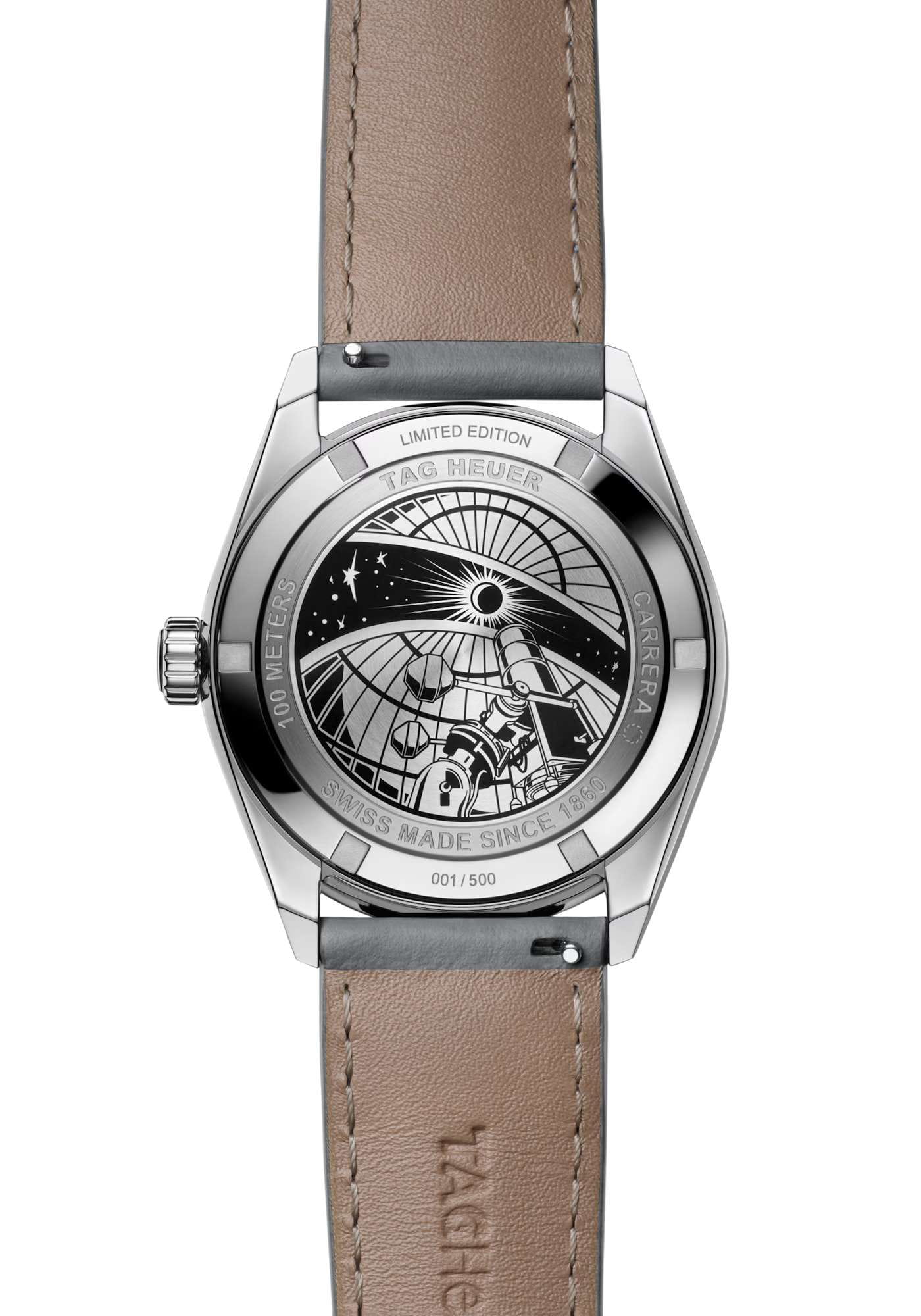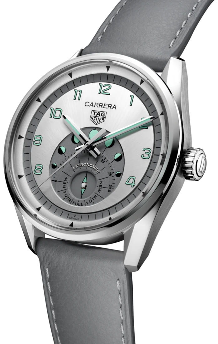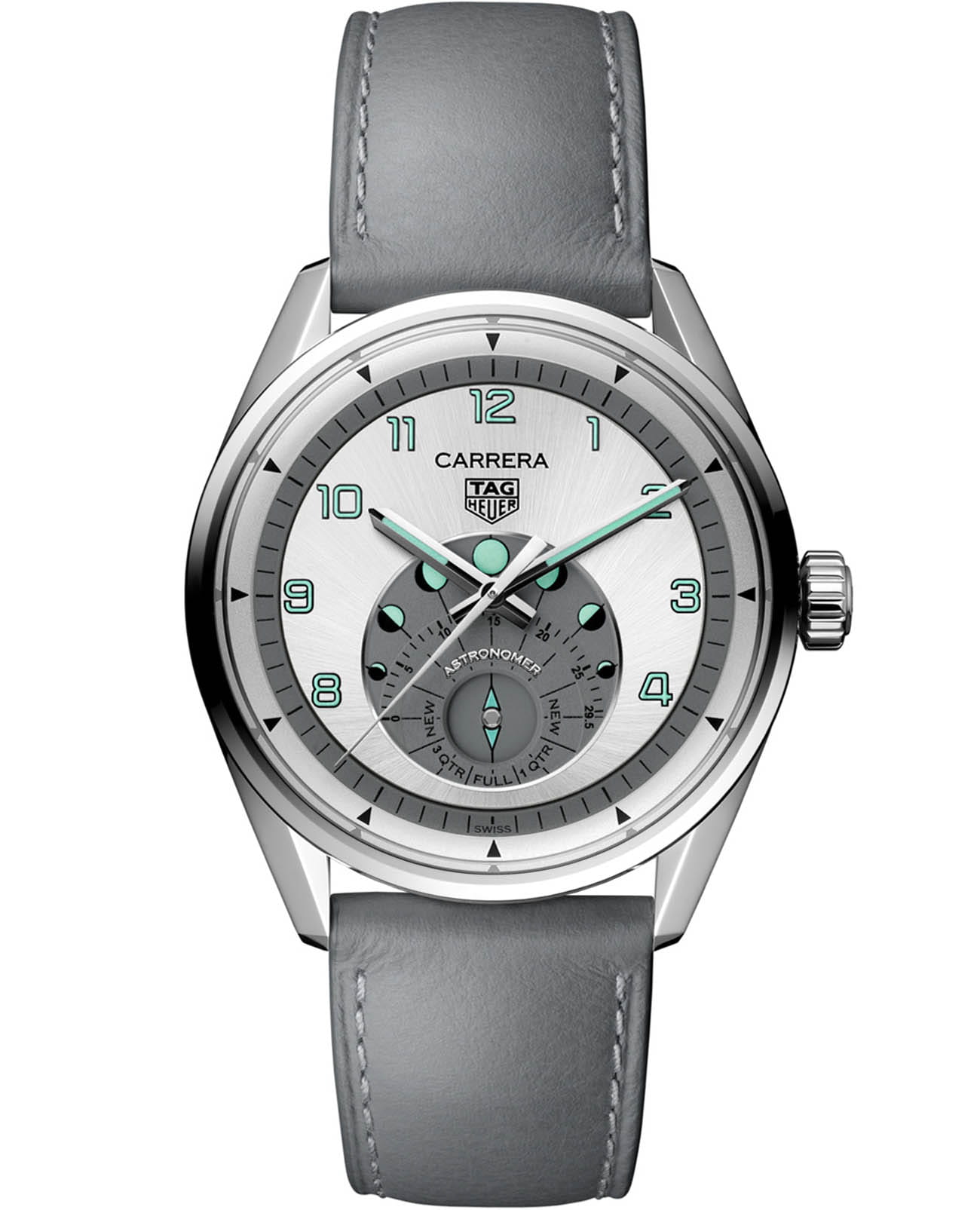 Часы TAG Heuer Carrera TAG Heuer Carrera Astronomer WBX2112.FC6615 созданы для стильных мужчин. Механический механизм (автоматический калибр) с высокой точностью и с 50-часовым запасом хода. Сапфировое стеклоСапфировое стеклоПрочный и надёжный материал из кристалла сапфира синтетического происхождения, характеризующийся особой твёрдостью и устойчивостью к царапинам и повреждениям. устойчивое к появлению царапин, обладающее высокой прозрачностью. Класс водозащиты: 100 метров, позволит плавать, нырять и заниматься другими водными видами спорта.  Стрелки с люминесцентным покрытиемЛюминесцентное покрытиеПозволяет считывать показания времени в темноте. Производители наносят на стрелки, часовые индексы, безель или поверхность циферблата светонакопительный состав, дающий холодное свечение. позволяют легко считывать время даже в условиях недостаточного освещения. Завинчивающаяся задняя крышка украшена специальной гравировкой с изображением обсерватории и звёздного неба. По центру, у отметки «6 часов», расположен серебристый диск указателя фаз Луны, обрамлённый оригинальной шкалой, которая позволяет визуально следить за ходом лунного цикла. Часы оснащены ремешком из кожи со стандартной застежкой, которая гарантируют комфортную посадку на запястье. Модель выпущена ограниченной серией 500 экземпляров. TAG Heuer Carrera олицетворяет непринужденную элегантность и представляет свежий взгляд на настоящую классику.