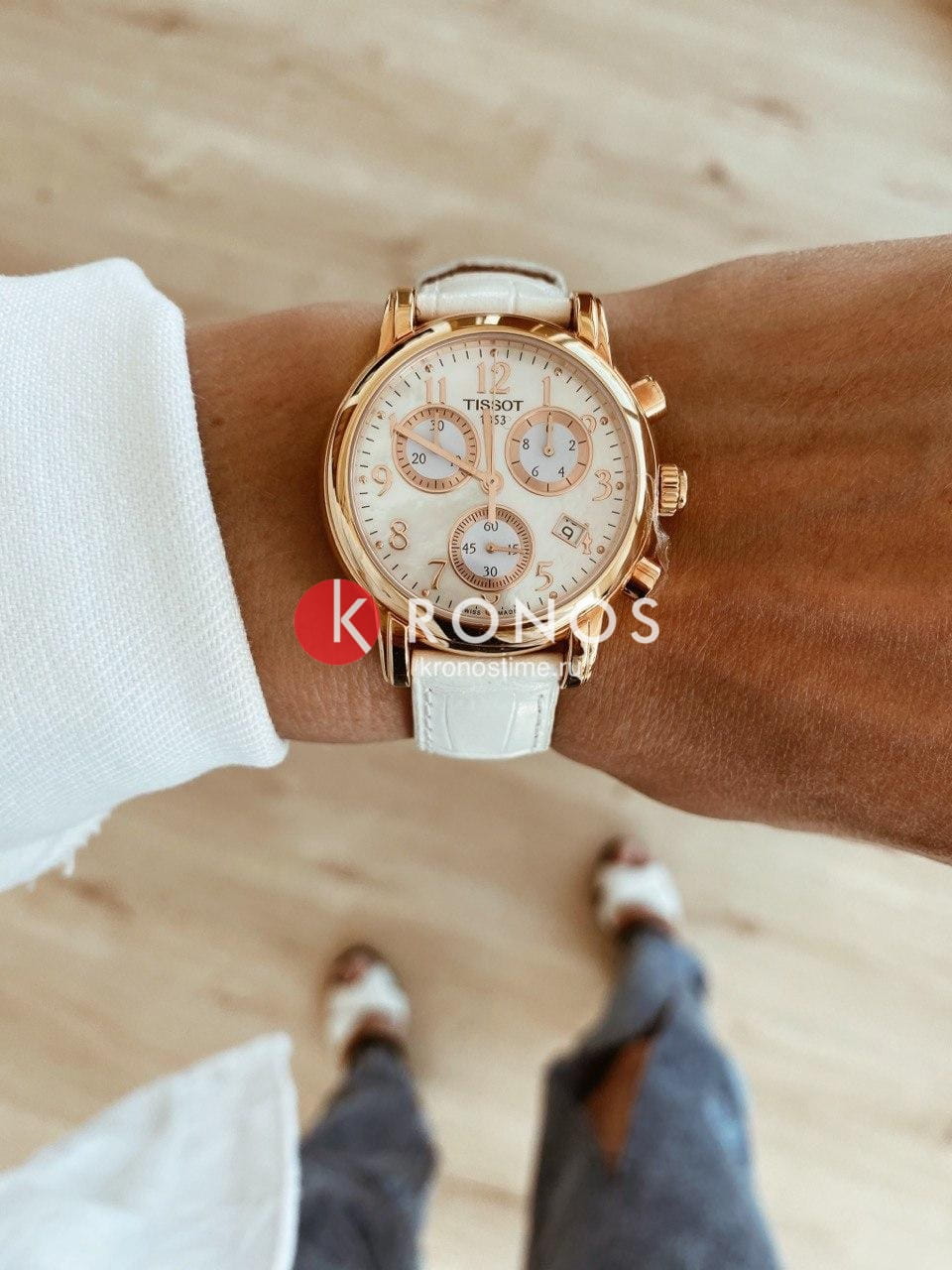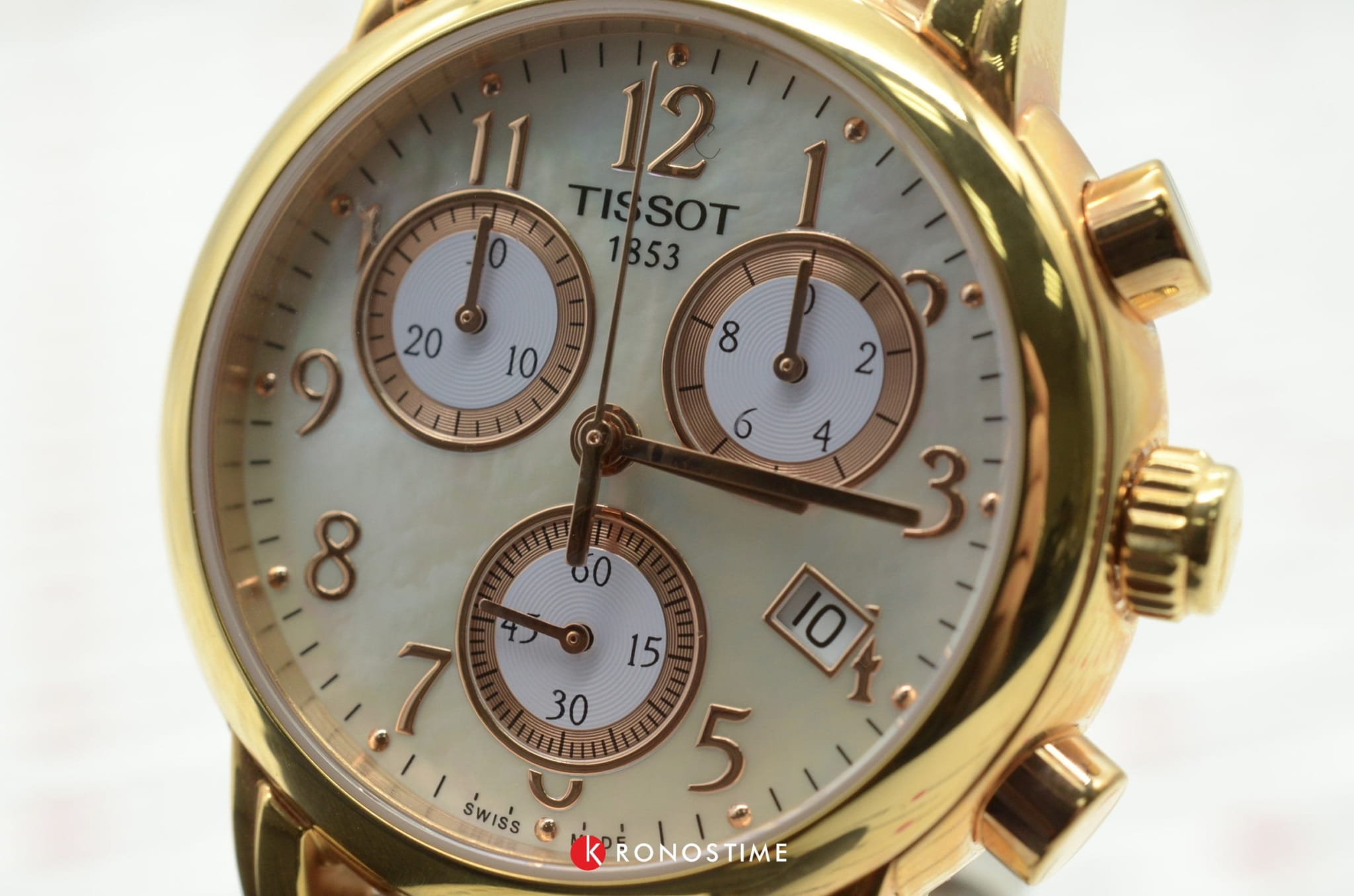 TISSOT Dressport Quartz Chronograph - женские кварцевые наручные часы. Корпус этих часов среднего размера (35 мм) и выполнен из нержавеющей стали L316 с PVD-покрытием цвета розового золота. Модель имеет устойчивое к царапинам сапфировое стекло, ремешок из натуральной кожи белого цвета, перламутровый циферблат. Калибр механизма: ETA G15.211. Класс водозащиты: 30 м / 3 АТМ (защита от брызг и случайных капель). Дополнительные функции и особенности: отображение числа, хронограф (секундомер).