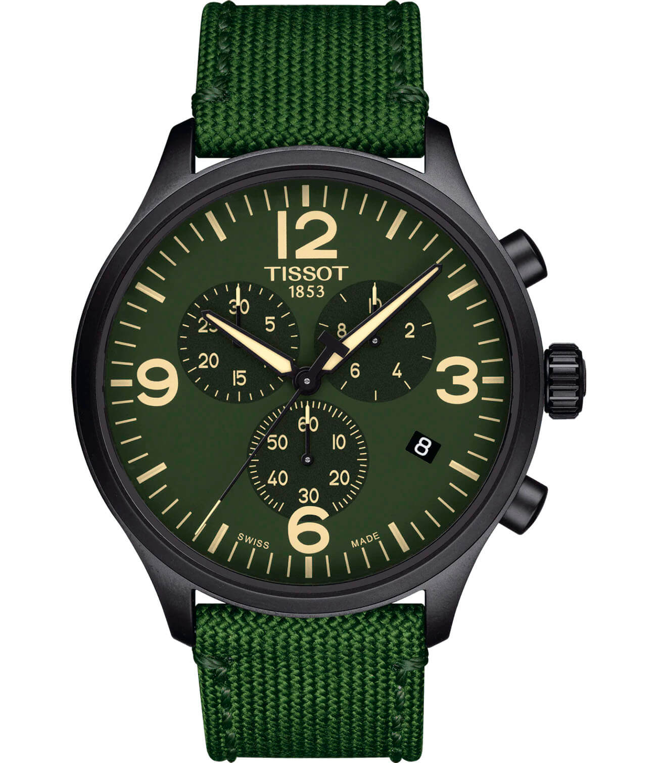 Для классического хронографаХронографФункция позволяет измерять отрезки времени с особой точностью: часы, минуты, секунды. Верным признаком хронографа является наличие на циферблате 3 дополнительных окошек-счётчиков. было выбрано чёрное исполнение, присутствуют контрастные индексы и стрелки. Наручные часы имеют тканевый ремешок NATO зеленого цвета, обеспечивающий невероятный комфорт при ношении. Высокоточный кварцевый механизм ETA G10.212. Люминесцентная подсветкаЛюминесцентное покрытиеПозволяет считывать показания времени в темноте. Производители наносят на стрелки, часовые индексы, безель или поверхность циферблата светонакопительный состав, дающий холодное свечение.. Цветное износоустойчивое PVD-покрытиеPVDУльтратонкое покрытие наносится в технике вакуумного напыления, сочетает в себе нитрид титана особой прочности со слоем золота или оксида хрома. Несёт в себе декоративную или защитную функцию. корпуса. Сапфировое стекло. Водонепроницаемость до 10 бар. Окошко даты, секундомер. Габариты: 45 x 45 x 11 мм.