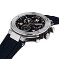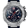 Высокая точность хода обусловлена наличием швейцарского кварцевого калибра ETA G10.212. Сапфировое стеклоСапфировое стеклоПрочный и надёжный материал из кристалла сапфира синтетического происхождения, характеризующийся особой твёрдостью и устойчивостью к царапинам и повреждениям. с антибликовым покрытием. Каучуковый ремешок. Люминесцентная подсветкаЛюминесцентное покрытиеПозволяет считывать показания времени в темноте. Производители наносят на стрелки, часовые индексы, безель или поверхность циферблата светонакопительный состав, дающий холодное свечение. стрелок и меток. Корпус из нержавеющей стали. Водостойкость 100 метров. Секундомер, тахиметрТахиметрРазмеченная шкала, располагается на ободке или безеле часов. Тахиметр позволяет рассчитать скорость на определённом участке пути, расстояние измеряется в километрах или милях., индикация числа. Габариты: 45 x 45 x 11,8 мм. Ограниченная серия из 8000 штук.