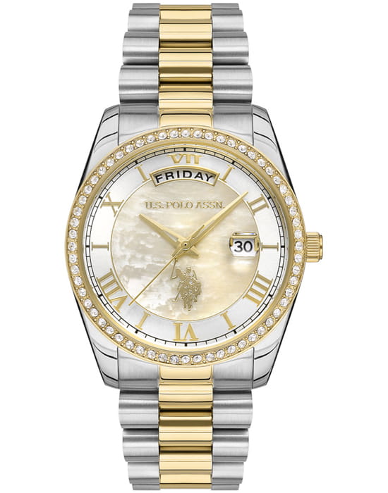 Женские часы U.S. Polo Assn. Stile USPA2054-07, кварцевый механизм с высокой точностью. Минеральное стеклоМинеральное стеклоМинеральное стекло представляет собой искусственно выращенный минерал кварца. Такое стекло отличается особой устойчивостью к повреждениям и царапинам. Уступает по некоторым качествам сапфировому стеклу. устойчивое к появлению царапин, обладающее высокой прозрачностью. Корпус изготовлен из нержавеющей стали. БезельБезельВнешний ободок, закрепляющий стекло. В спортивных часах так называется поворотное кольцо с делениями на циферблате, выполняет роль таймера – замеряет отрезки времени на шкале. Неподвижный безель – элемент декора. Однонаправленно вращающийся безель на дайверских часах позволяет фиксировать моменты погружения и выныривания на поверхность. из нержавеющей стали с IP-покрытиемIP-покрытиеМетод ионного напыления. Демонстрирует повышенную устойчивость к истиранию, окислению и химическим веществам. Под воздействием высокого давления и температуры около 1500°C молекулы металла надёжно соединяются с частицами корпуса часов. и украшен кристаллами. Окошко даты в положении 3 часов, окошко дня недели в положении 12 часов. Класс водозащиты: 50 метров, позволит защитить корпус от случайных брызг или капель дождя. Стальной браслет с частичным IP-покрытиемIP-покрытиеМетод ионного напыления. Демонстрирует повышенную устойчивость к истиранию, окислению и химическим веществам. Под воздействием высокого давления и температуры около 1500°C молекулы металла надёжно соединяются с частицами корпуса часов. на застёжке «бабочка» с кнопкамиЗастёжка "бабочка"Такой вид застёжки дополняется предохранителями, помогающими избежать случайного раскрытия браслета. Обладают изящным исполнением. .
