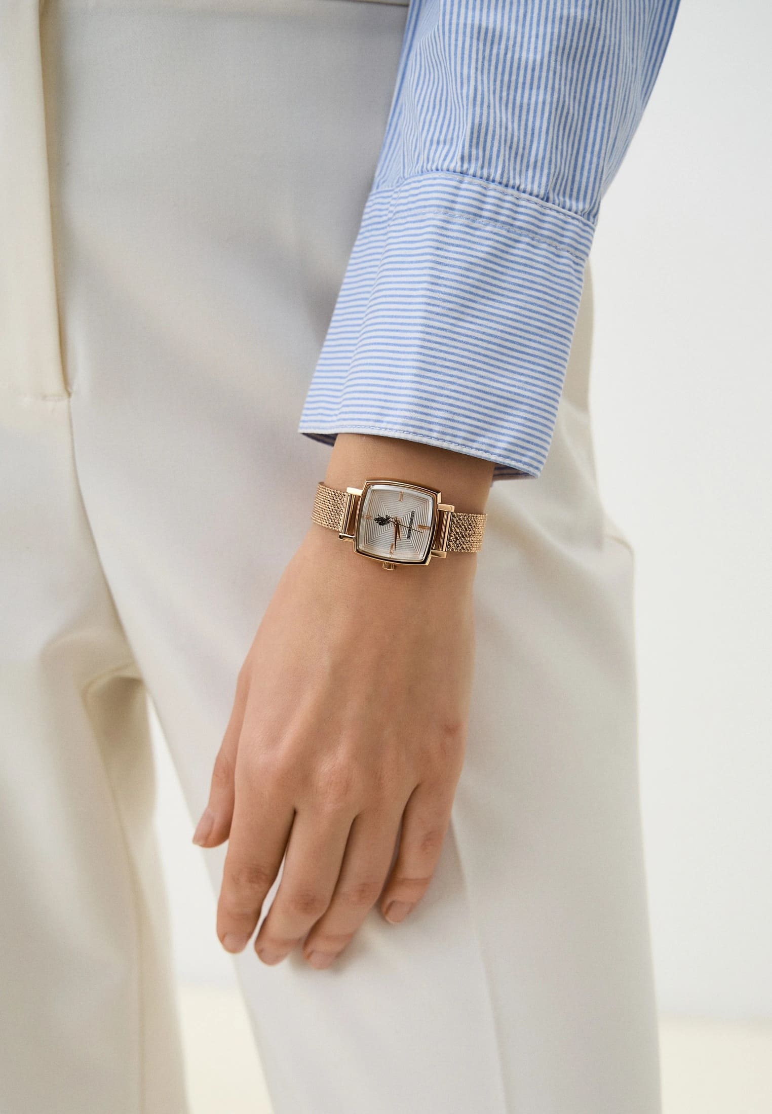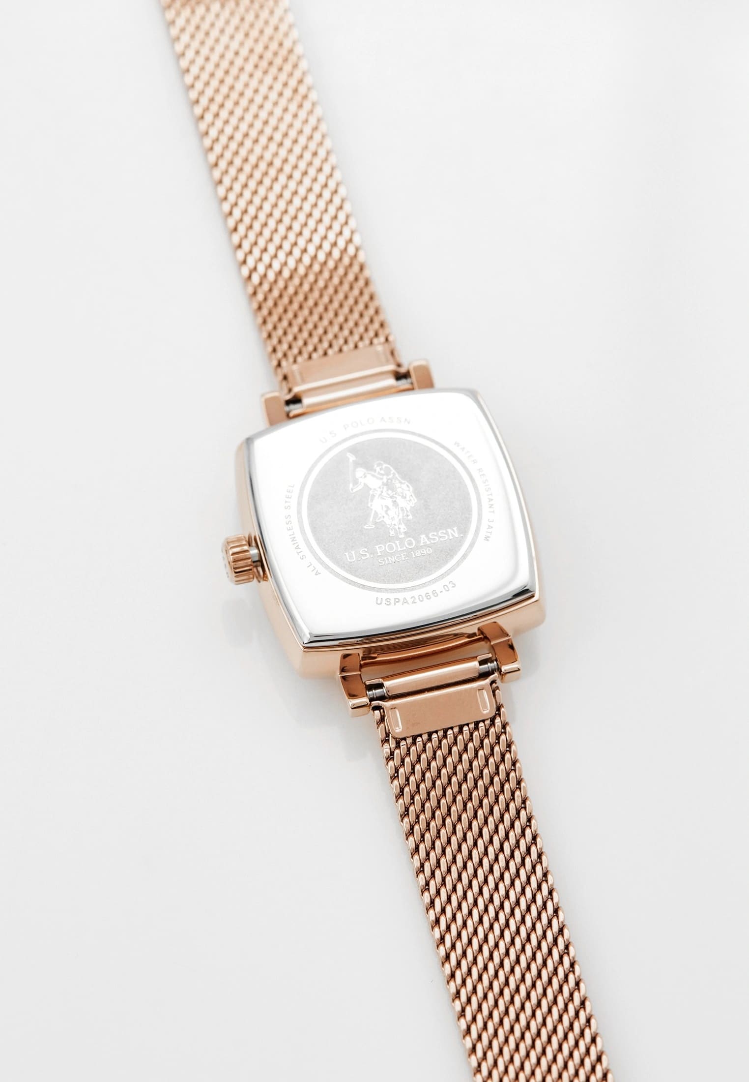 Женские наручные часы U.S. Polo Assn. Stile USPA2066-03 — это стильный и лаконичный аксессуар, выполненный в форме квадрата. Модель изготовлена из стали с PVD-покрытиемPVDУльтратонкое покрытие наносится в технике вакуумного напыления, сочетает в себе нитрид титана особой прочности со слоем золота или оксида хрома. Несёт в себе декоративную или защитную функцию. цвета розового золота, что придаёт ей благородный внешний вид и устойчивость к царапинам. Циферблат белого цвета дополнен секундной стрелкой, обеспечивающей точность отсчёта времени. Защиту циферблата обеспечивает минеральное стеклоМинеральное стеклоМинеральное стекло представляет собой искусственно выращенный минерал кварца. Такое стекло отличается особой устойчивостью к повреждениям и царапинам. Уступает по некоторым качествам сапфировому стеклу., устойчивое к мелким повреждениям. Часы оснащены кварцевым механизмом, гарантирующим точность и минимальное обслуживание. Водонепроницаемость 3 АТМ позволяет использовать часы в повседневных условиях — при мытье рук или под лёгким дождём. Браслет выполнен в технике миланской сетки из стали с покрытием розового золота и оснащён раскладным замкомРаскладной замокДанный вариант застежки используется только на часах с металлическим браслетом. Отличительная особенность такого крепления в том, что длина браслета становится универсальной и вы можете самостоятельно отрегулировать нужный вам размер – застежка просто двигается по браслету часов., обеспечивающей комфорт и уверенную фиксацию на запястье. Толщина корпуса составляет 10 мм, а его размеры — 26x26 мм, что делает часы компактными и удобными в носке. Эти часы станут универсальным аксессуаром для уверенных в себе женщин, которые ценят сочетание стиля, качества и эстетики — идеальный выбор для повседневного образа и торжественных случаев.