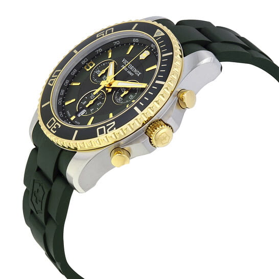 Мужские швейцарские часы Victorinox 241694 из коллекции Maverick Chronograph сочетают спортивную функциональность и элегантный дизайн. Модель представлена круглым корпусом диаметром 43 мм из нержавеющей стали 316L с частичным PVD-покрытиемPVDУльтратонкое покрытие наносится в технике вакуумного напыления, сочетает в себе нитрид титана особой прочности со слоем золота или оксида хрома. Несёт в себе декоративную или защитную функцию. в золотистом оттенке, дополненным насыщенным зеленым циферблатом. Часы оснащены высокоточным швейцарским кварцевым механизмом Ronda 5030.D с функцией хронографа (измерение до 30 минут с точностью 1/10 секунды), тахиметрической шкалой и апертурой даты. Циферблат защищен сапфировым стекломСапфировое стеклоПрочный и надёжный материал из кристалла сапфира синтетического происхождения, характеризующийся особой твёрдостью и устойчивостью к царапинам и повреждениям. с тройным антибликовым покрытием, устойчивым к царапинам, а люминесцентные стрелки Super-Luminova® обеспечивают отличную читаемость в темноте. Водонепроницаемость 10 ATM (100 метров) позволяет использовать часы для плавания и снорклинга. Однонаправленный вращающийся безель в дайверском стиле дополняет функционал модели. Резиновый ремешок зеленого цвета шириной 22 мм с классической пряжкой обеспечивает комфортную посадку на запястье.