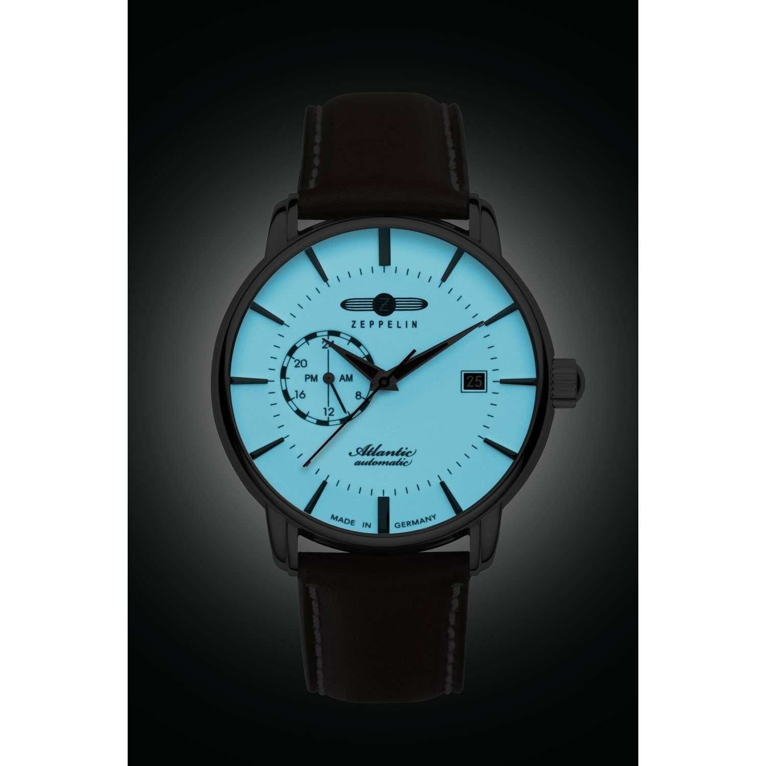 Часы Zeppelin 8470-5 — это квинтэссенция элегантности и точности.  Эти часы оснащены автоматическим механизмом с серебристым стальным корпусом круглой формы и коричневым ремешком с пряжкой из натуральной кожи. Эта модель отличается циферблатом, который полностью покрыт люминесцентным покрытиемЛюминесцентное покрытиеПозволяет считывать показания времени в темноте. Производители наносят на стрелки, часовые индексы, безель или поверхность циферблата светонакопительный состав, дающий холодное свечение., благодаря чему светится в темноте, также циферблат дополнен датой дня месяца и дополнительным циферблатом с указанием времени в 24-часовом формате. Закаленное минеральное стеклоМинеральное стеклоМинеральное стекло представляет собой искусственно выращенный минерал кварца. Такое стекло отличается особой устойчивостью к повреждениям и царапинам. Уступает по некоторым качествам сапфировому стеклу. защищает от царапин, что делает его идеальным выбором для любого джентльмена. Водонепроницаемость этой модели составляет 50 метров. Эти часы подойдут для повседневного ношения и станут ярким акцентом в вашем наряде.